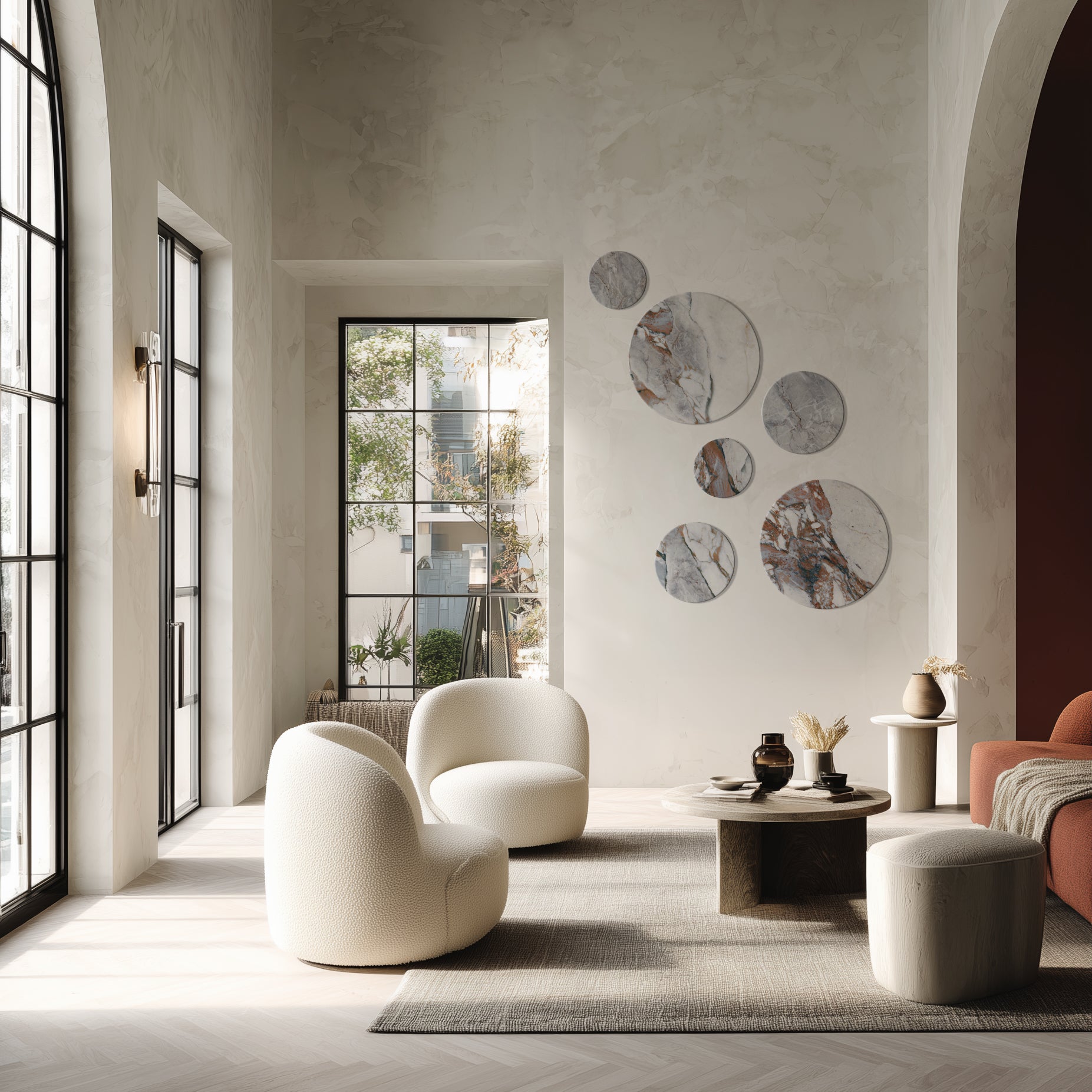 طقم "الظل الدافئ" الجداري الدائري بتأثير الرخام يجلب طابعاً خالداً وأناقة عصرية ناعمة لأي مساحة داخلية.