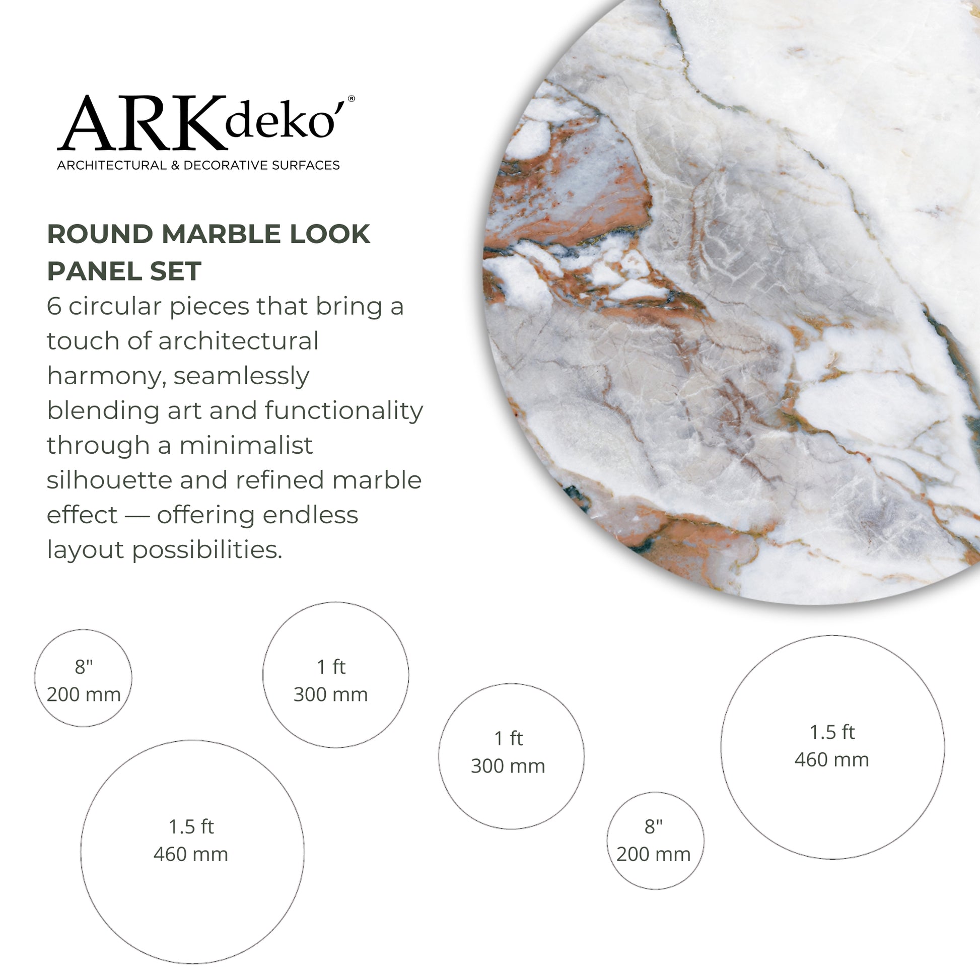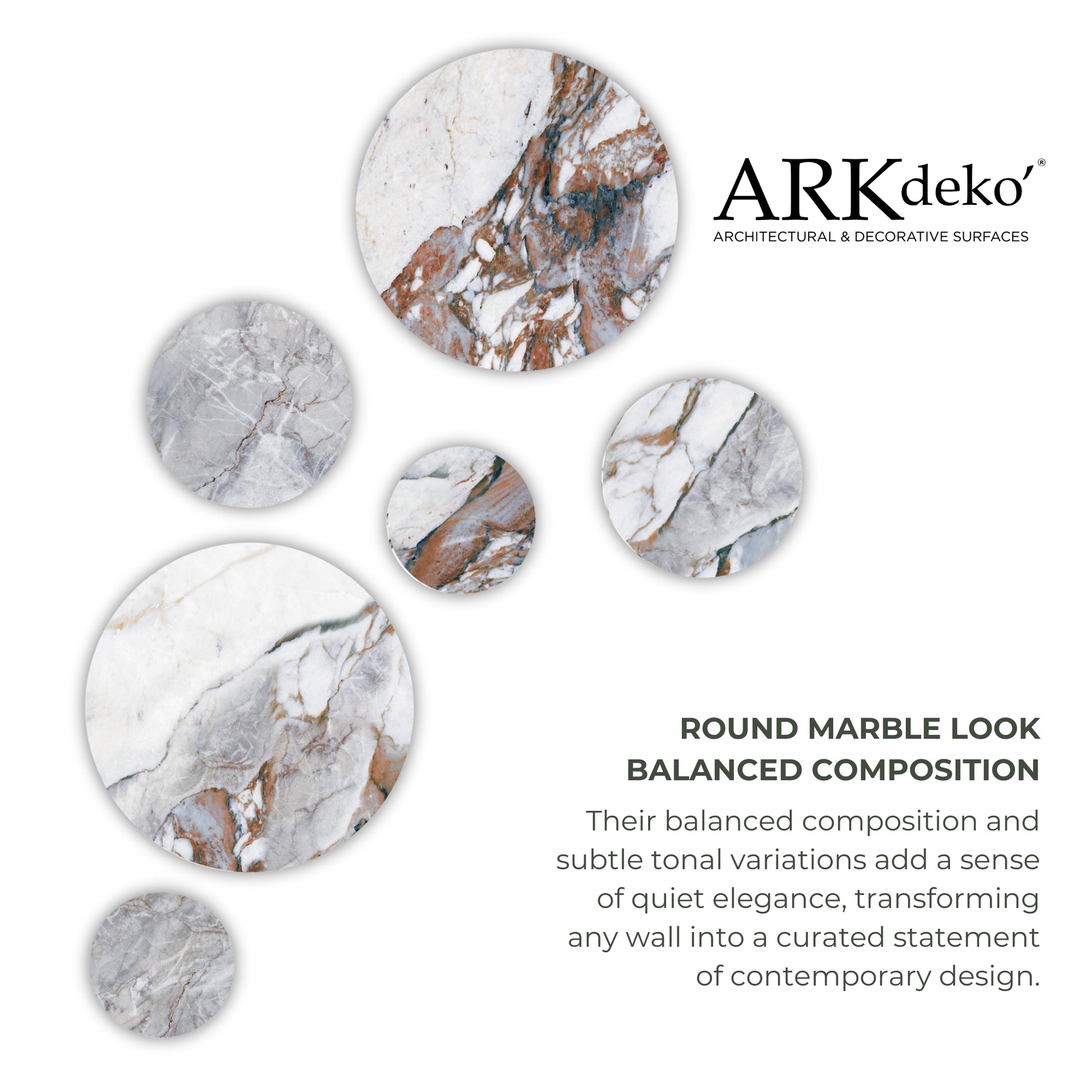 يتكوّن من ست قطع فنية نحتية مستديرة، ويتميز بمزيج من تعرّقات الرخام الدافئة من طراز "برونز أطلس"، تشمل درجات العاج والطين والعنبر والرمادي الأردوازي، مختارة بعناية من بين أرقى الأسطح الديكورية لدى ARKdeko’. مثالي للتنسيق مع الجدران المجاورة المغطاة بألواح "برونز أطلس".