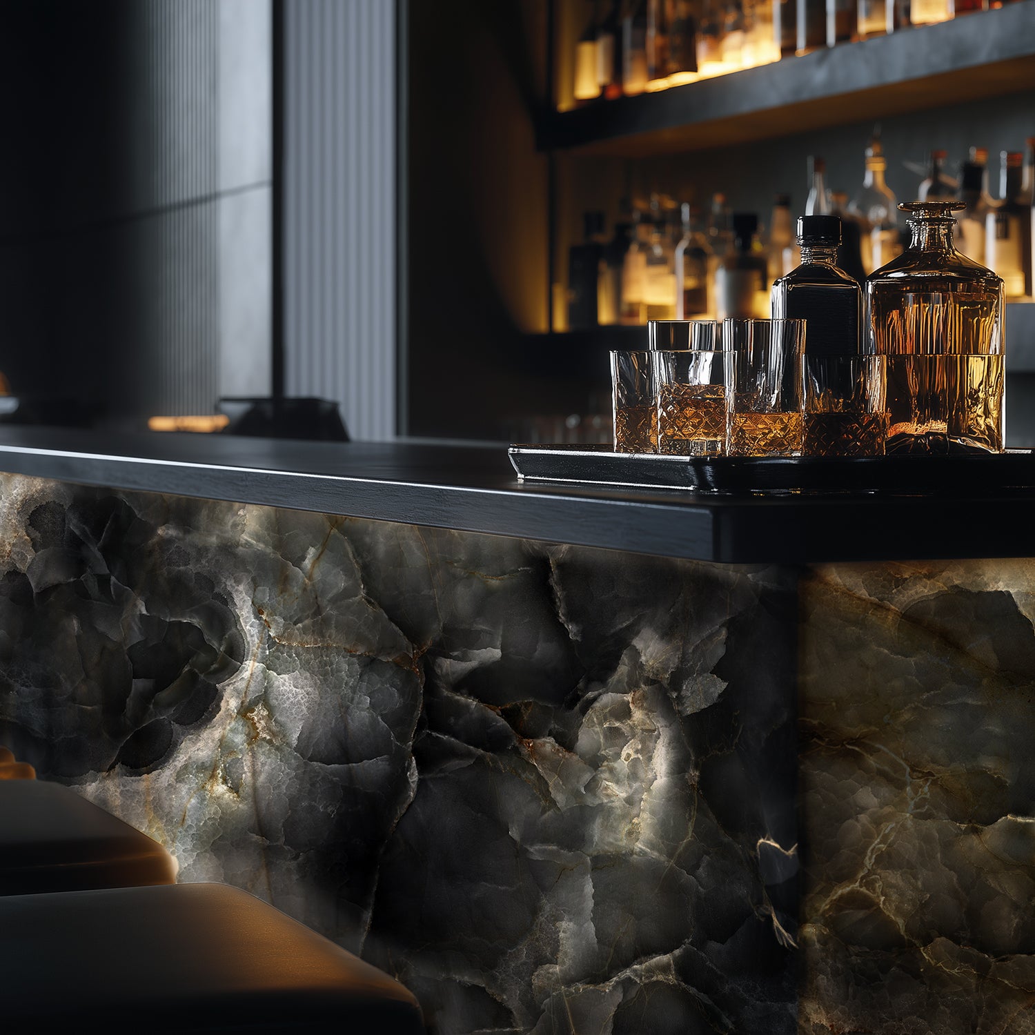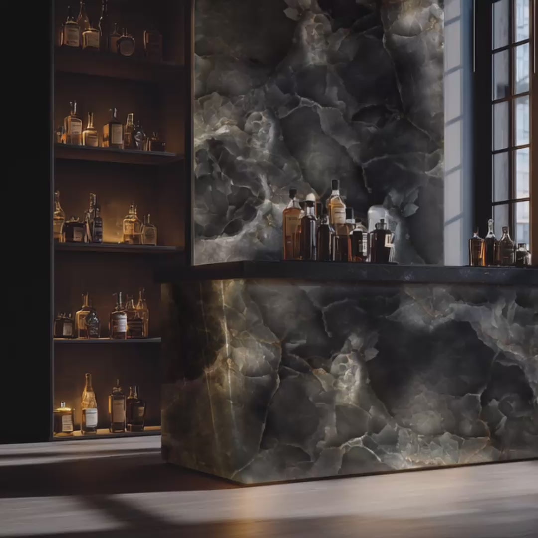 سواء تم استخدامها كجدار بارز مع ألواح لاصقة بسيطة، أو كواجهة بار مضيئة، أو كخلفية متوهجة للرفوف، فإن نموذج Onyx Grey يعزز أي بيئة بمزيج من القوة والرقي.