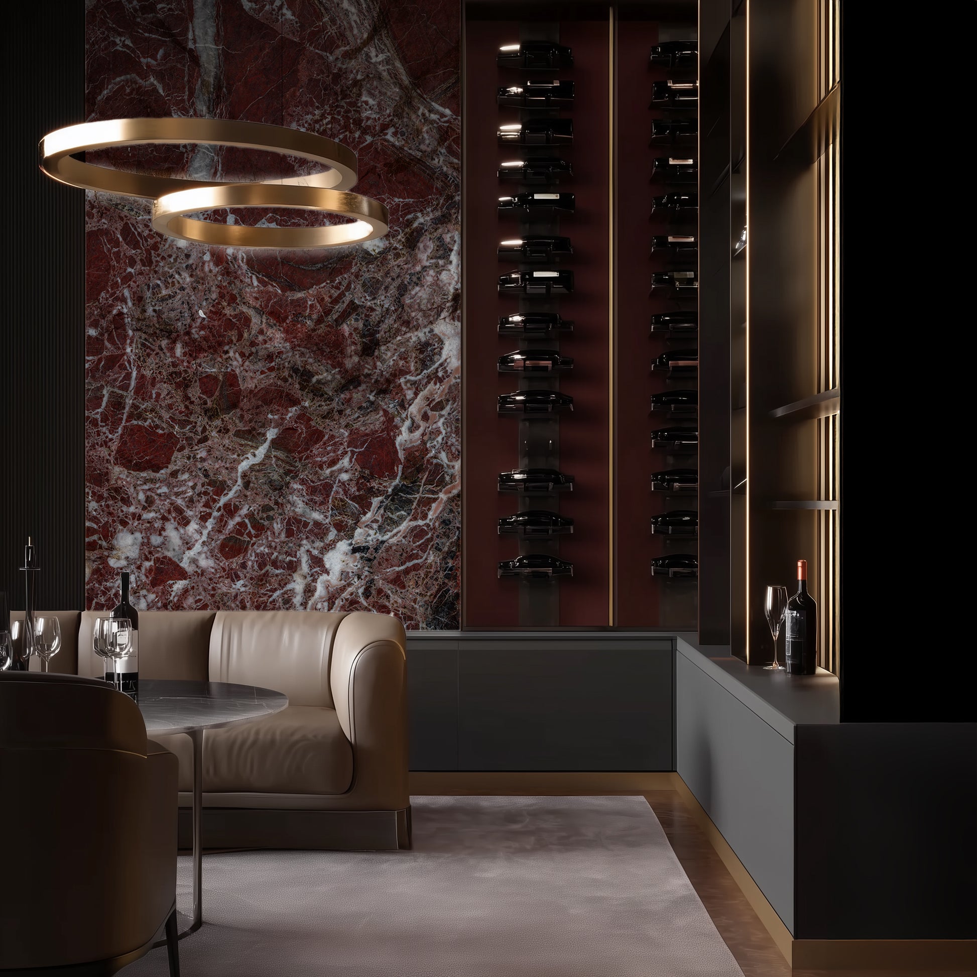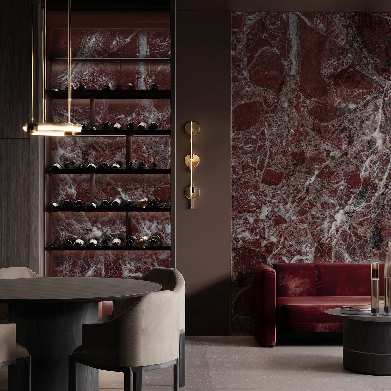مستوحاة من رخام Rosso Levanto الأيقوني، تلتقط هذه الألواح عمق الدرجات العنابية الغنية، المُعززة بتعرّقات بيضاء لافتة، لتخلق جواً يجمع بين الرقي والدراما.