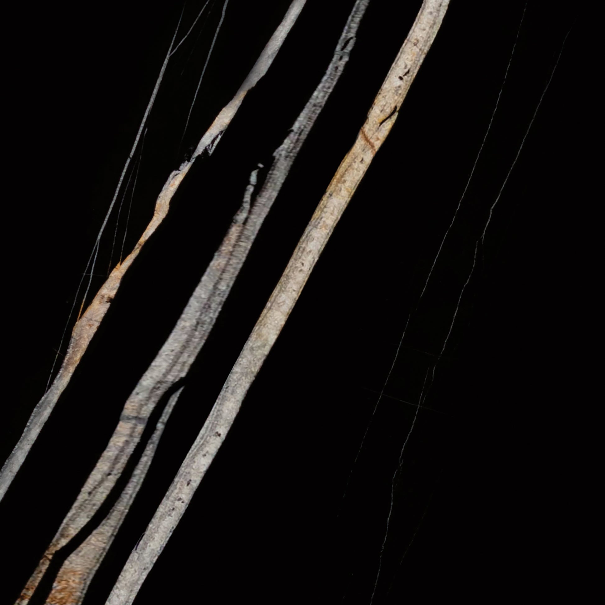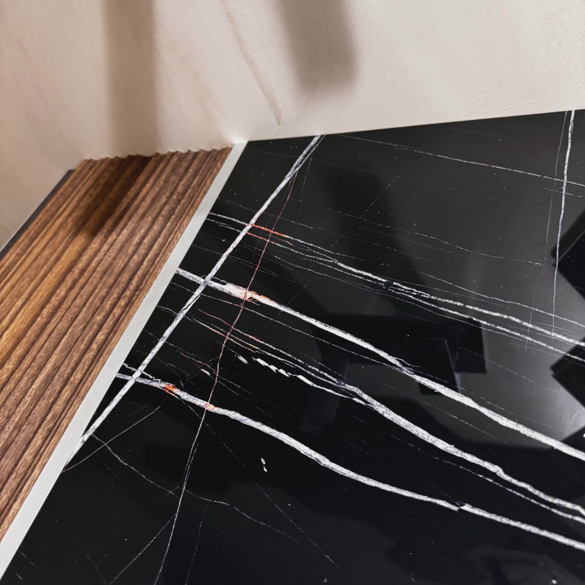تعمل الخلفية السوداء كلوحة جريئة تبرز التفاصيل المتقنة للعروق البرتقالية والبنية التي تمتد بانسيابية وأناقة عبر السطح. تضيف هذه العروق تباينًا ديناميكيًا وراقيًا، مستوحى من مشاهد الصحاري المضيئة تحت سماء الليل المرصعة بالنجوم. أما حبيبات الأرابيسكاتو، فتضفي عمقًا وملمسًا إضافيًا، متداخلة بأنماط منحنية تنبض بجمال الرخام الكلاسيكي.