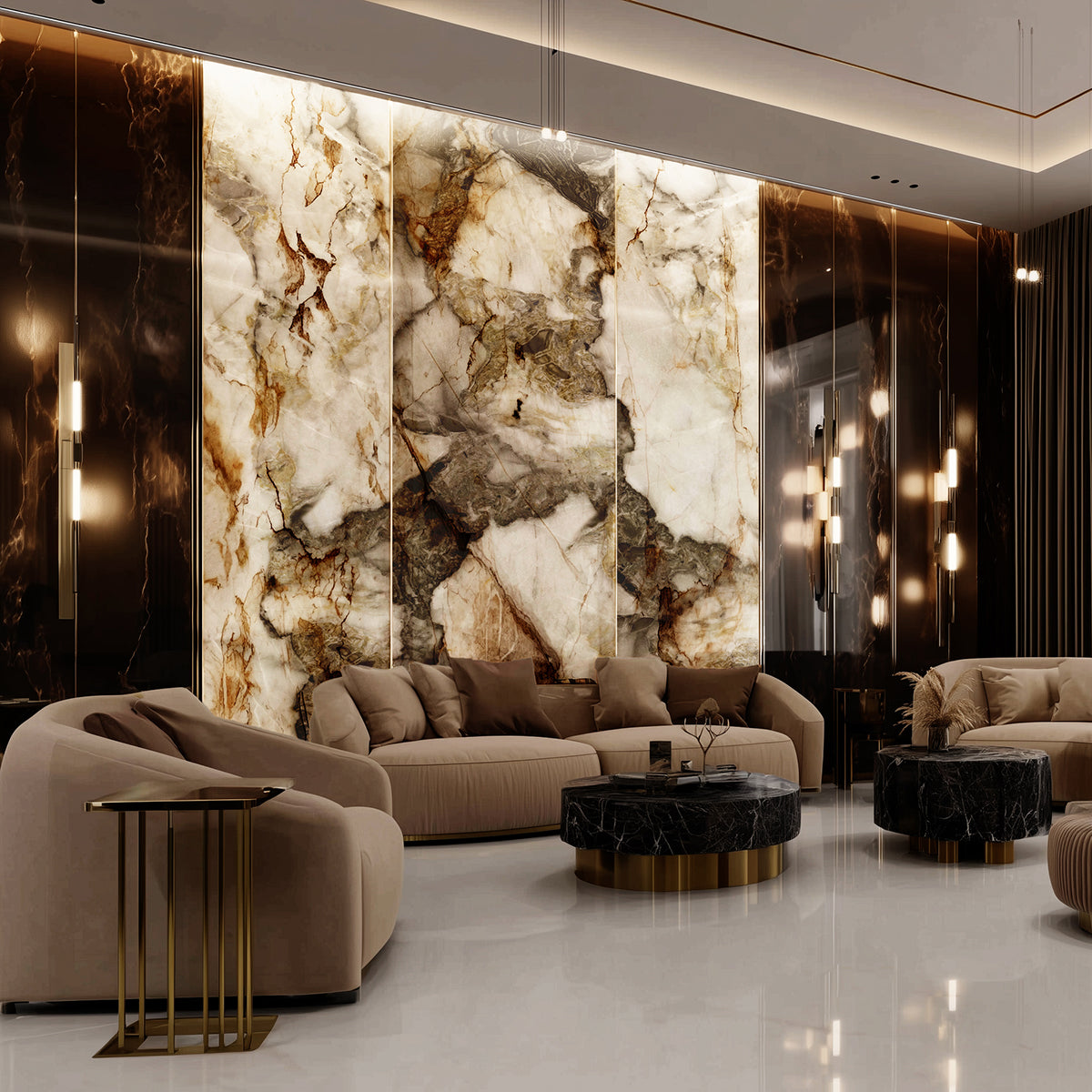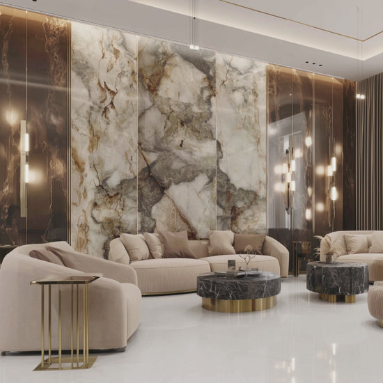 Les veinures douces et la profondeur lumineuse de ce modèle créent une atmosphère raffinée, idéale pour les entrées, les salons ou les espaces de vie. Inspirés par la qualité sculpturale de l'albâtre véritable, ces panneaux allient savoir-faire italien et innovation moderne.