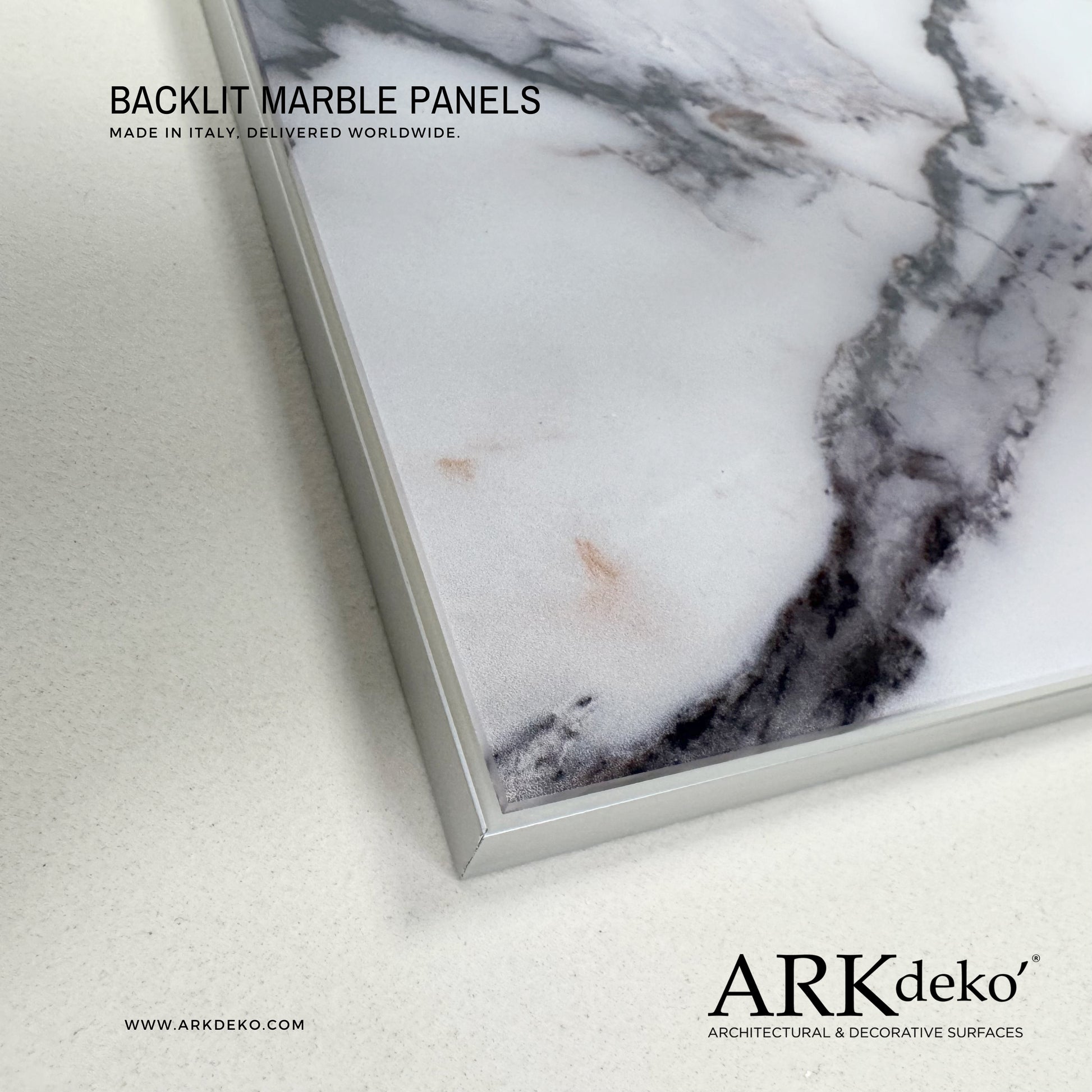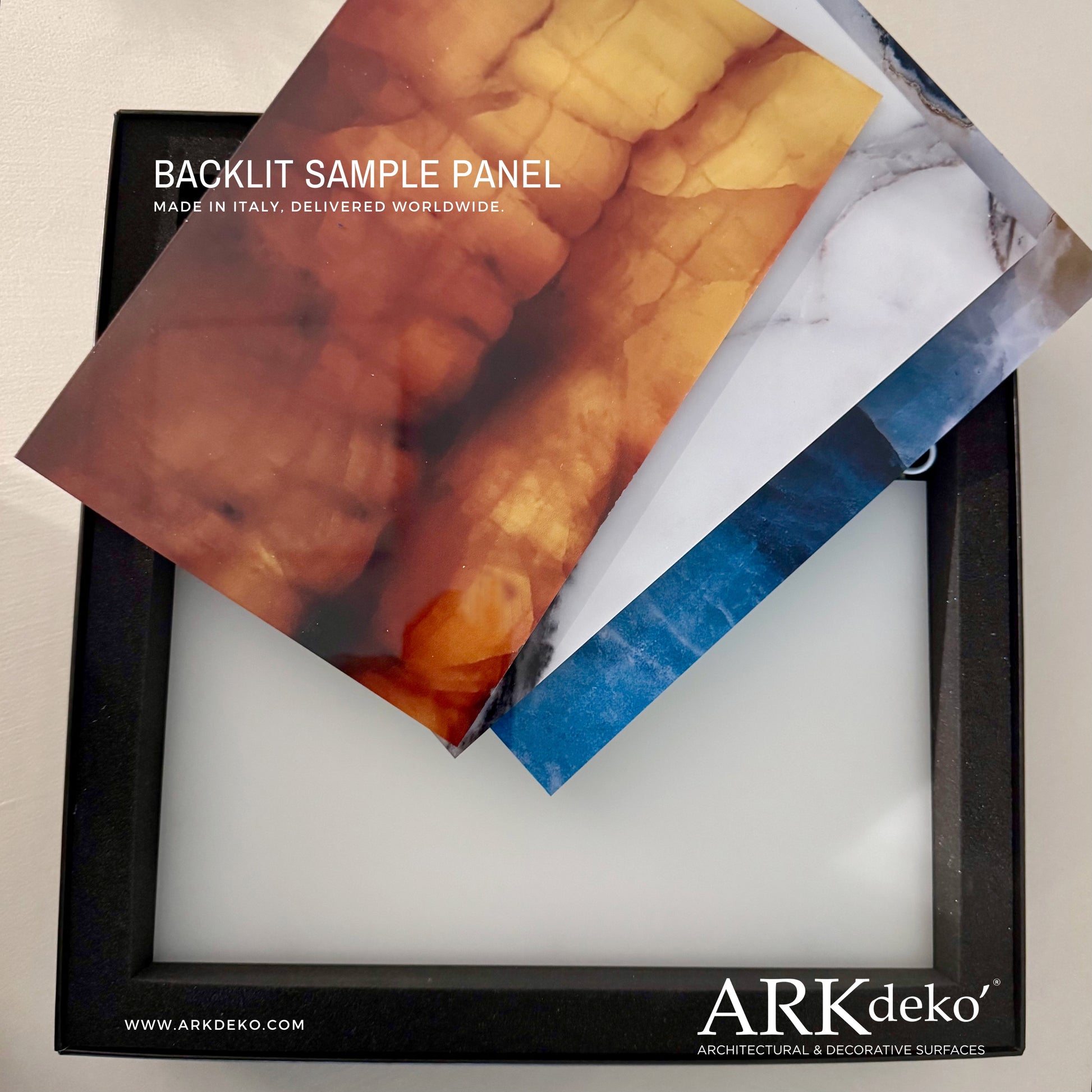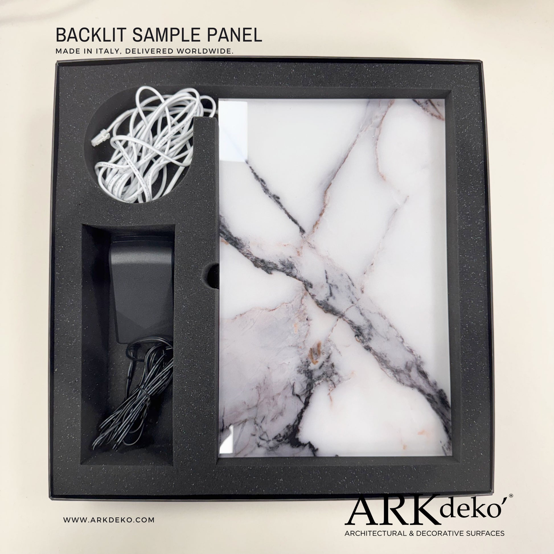 NEW MODEL! Experience the trasformative power of integrated lighting with our Complete Luminous Sample Panel. This visual tool is designed to provide a true representation of how the colors of your favorite marble light up. Measuring just 7x11 inches and 13mm (0.5 inch) in thickness, this slim and lightweight sample is both practical and versatile.