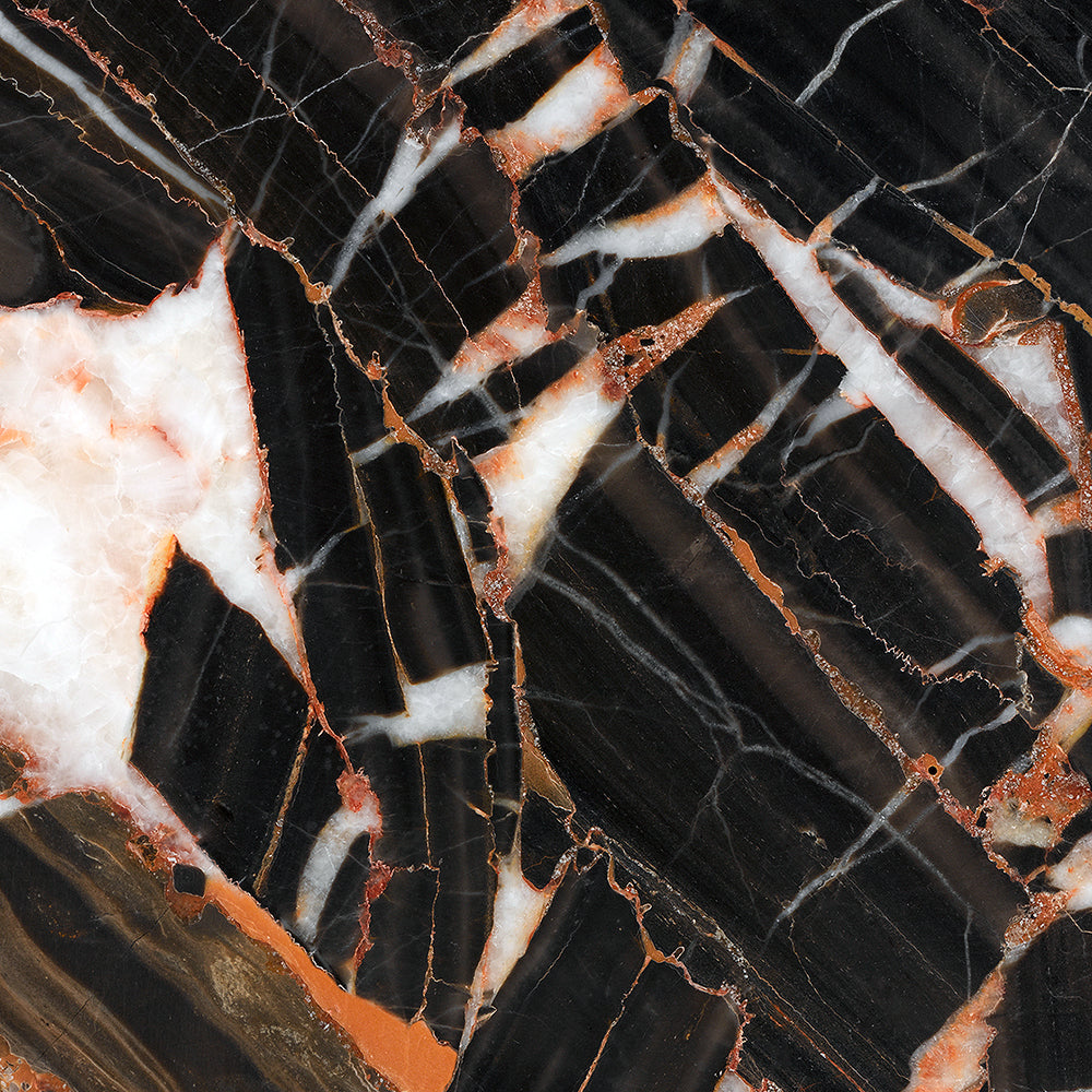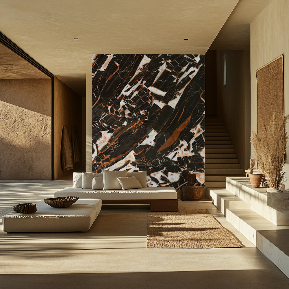 Kalahari is an expressive decorative wall panel that reimagines the raw power of desert landscapes through a refined design lens. This striking surface features an intricate interplay of deep black, warm bronze, and crystalline white veining, evoking rare exotic marbles shaped by time and heat.