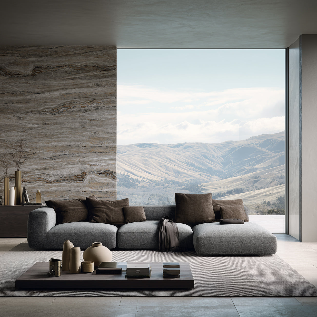 Inspired by classic Italian stone architecture, Travertino offers a harmonious palette of warm greys, sand tones, and subtle beige and blue nuances. The texture is fluid yet structured, evoking sedimentary layers shaped by time, while maintaining a clean and contemporary aesthetic suitable for modern living spaces.