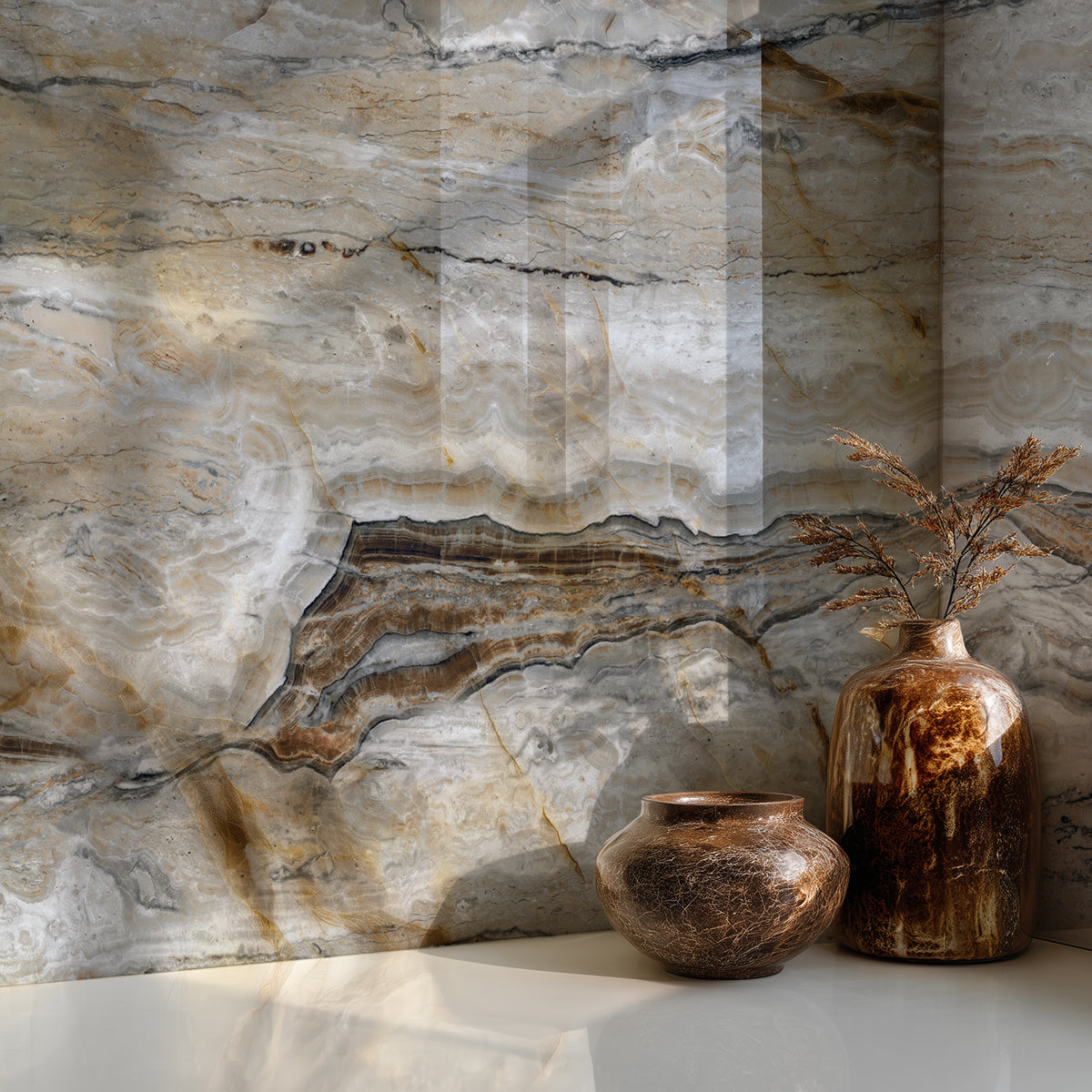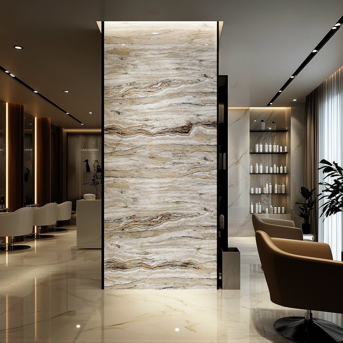 Designed for versatility, Travertino panels are ideal for accent walls, large feature partitions, TV wall units, spa-inspired bathrooms, hospitality interiors, and refined living areas. Their visual softness makes them particularly effective in spaces where natural light interacts with the surface, enhancing depth and movement throughout the day.